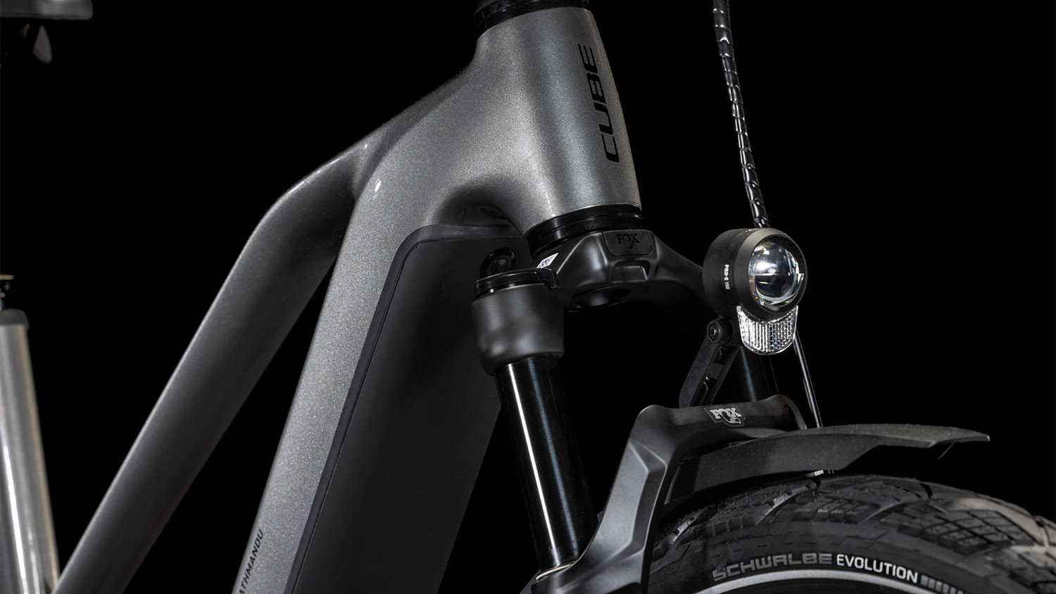 Elegantes, zeitloses Design – das ist das Kathmandu Hybrid von CUBE. Auf den ersten Blick – der zweite gibt den Weg auf jede Menge Innovationen und clevere Details frei. Der samt PowerTube Akku ästhetisch und sauber ins Design integrierte CX Motor von Bosch ist dabei nur der Anfang. Die Efficient Comfort Geometry arbeitet harmonisch mit der 100 mm Federgabel Hand in Hand, was die Kontrolle vor allem unter schwierigen Bedingungen unterwegs optimiert. Dazu die interne Zugverlegung, die der cleanen Optik des Chassis in die Karten spielt und den Wartungsaufwand maßgeblich reduziert. Was noch? Ein vielseitiges, beinahe unzerstörbares UDH für einfache Ersatzteilverfügbarkeit, ein integrierter Kettenschutz und ein stabiler, robuster, überaus formschöner integrierter Gepräckträger IC 3.0, auf dem alles Platz findet, was auf Abenteuertour mit muss.