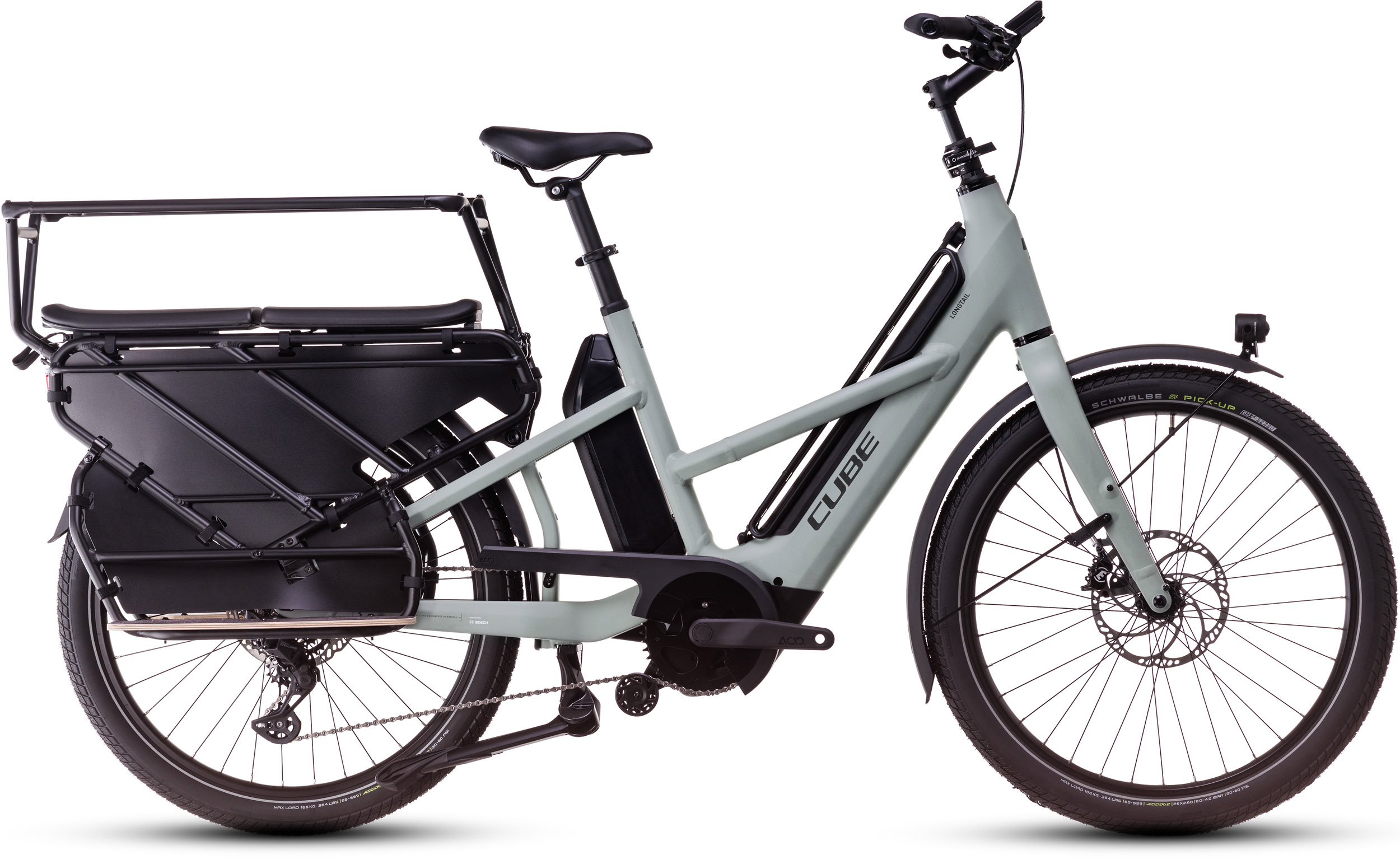 Das Geheimnis der Lasten-Power des CUBE Longtail-Bikes? Sein stabiles und vielfältig anpassbares Gepäckträgersystem am Heck. Das Longtail Hybrid 725 Family ist serienmäßig mit einer bequemen Kindersitzbank mit Seitenschutz und Trittbrettern ausgestattet, sodass die Kids zu jeder Zeit sicher und komfortabel mitfahren. Bei einem Systemgewicht von bis zu 200 kg lässt es keine Wünsche offen. Für starke und zuverlässige Unterstützung im Vorwärts wurde einen Bosch Cargo Line Motor integriert, der von einem 725 Wh starken Akku gespeist wird. Optional kann ein zweiter Akku dazugenommen werden – für insgesamt 1350 Wh Leistung. Übrigens: Dank praktischer Anpassungsoptionen, zum Beispiel das Herausnehmen der Kindersitzbank, lässt sich noch mehr Platz für Ladung schaffen und das Bike zum ultimativen Lastenfahrrad umrüsten. So vielseitig, so umweltfreundlich, so Longtail.